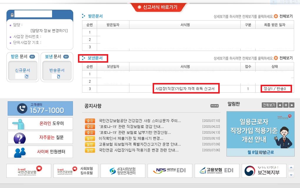 보내문서에 사업장(직장)가입자 자격취득 신고서 상태가 정상으로 되어있으면 처리 완료!