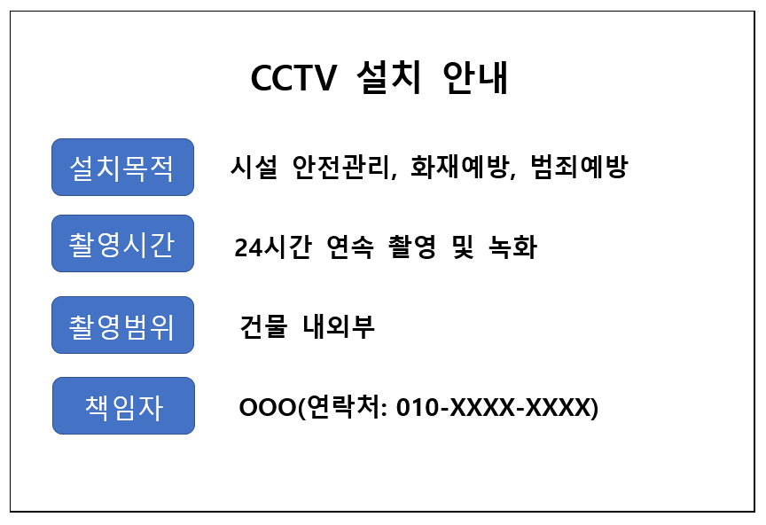 CCTV를 설치할 경우 개인정보보호법 제25조제4항에 따라 위의 사항이 기재된 안내판을 부착하여야 합니다.