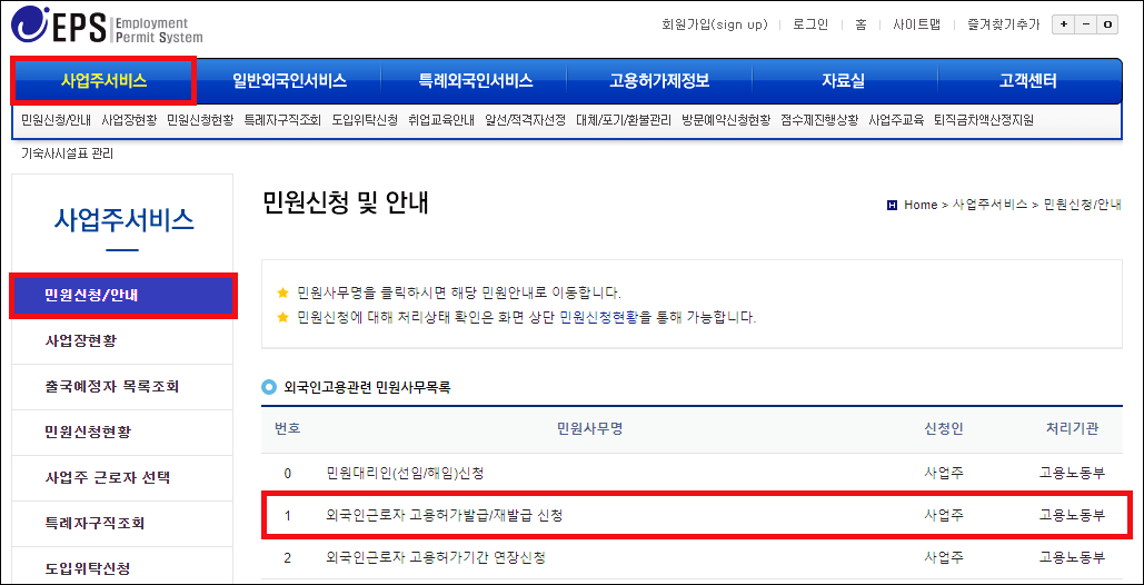 - 고용허가제 홈페이지(https://www.eps.go.kr) 접속 → 로그인 → 사업주서비스 → 민원신청/안내 → 외국인근로자 고용허가서 발급/재발급 신청