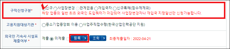 - 단, 구직신청 구분은 사업장 변경이 아닌 신규를 선택해주세요.