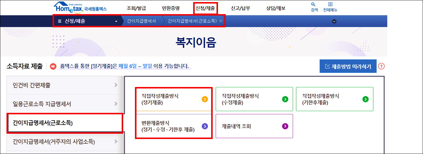 1. 국세청홈택스(https://www.hometax.go.kr) 접속 → 기업 로그인 → 신청/제출 → 간이지급명세서(근로소득) → 제출방식 선택