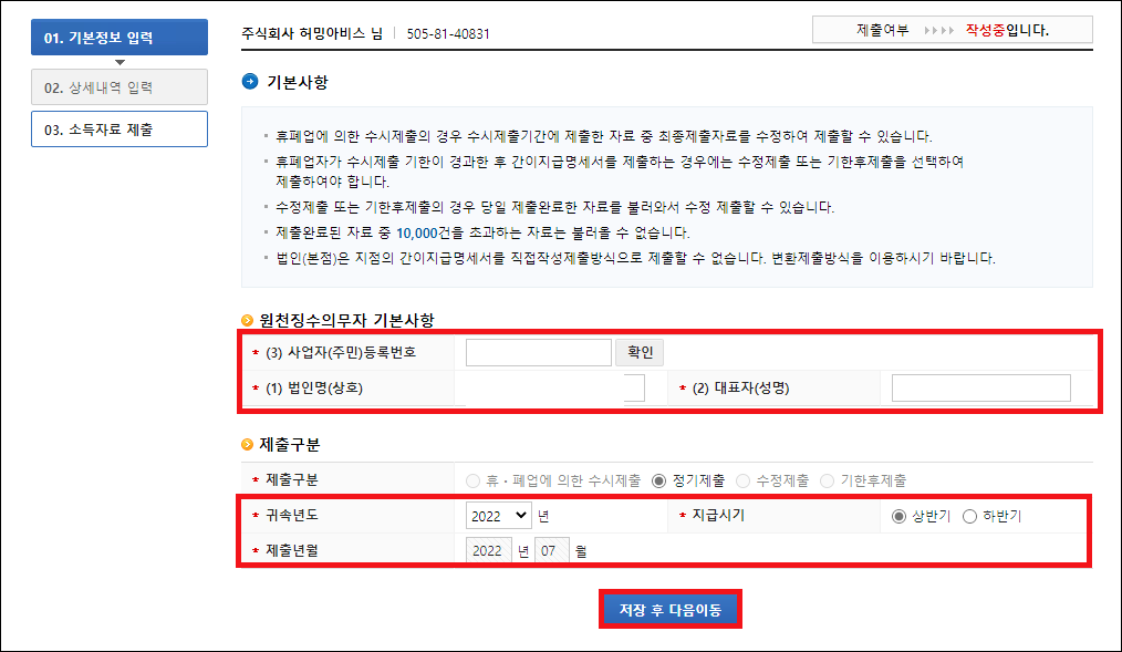 2. 원천징수의무자 기본사항 작성 → 귀속년도, 지급시기, 제출년월 입력 → 저장 후 다음이동