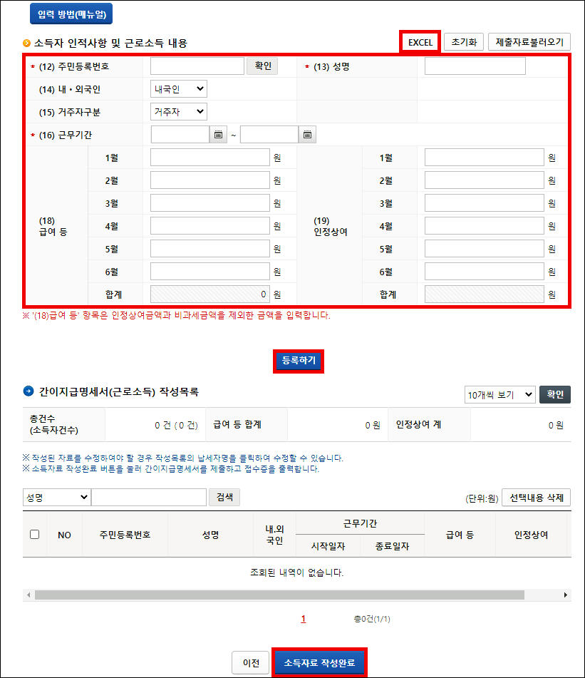 - 엑셀을 이용하여 소득자별 내용을 작성 후 한꺼번에 등록하기를 원하시는 경우 상단의 EXCEL 버튼을 눌러 엑셀 양식을 다운로드한 뒤 해당 양식에 내용을 기재하고 다시 EXCEL 버튼을 눌러 파일을 업로드해줍니다.