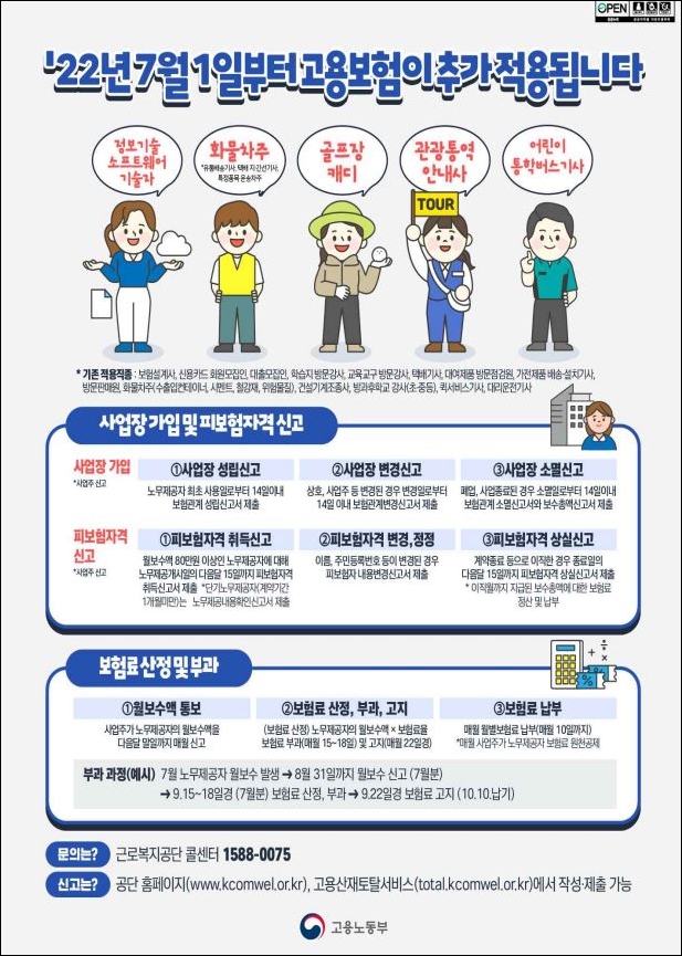 2022년 1월 1일부로 플랫폼 노무제공자인 퀵서비스 기사, 음식 배달기사, 대리운전기사의 고용보험 적용이 실시되었습니다. 이번 7월부터는 여기에 소프트웨어 기술자, 어린이 통학버스 기사 등에 대해 고용보험을 추가로 적용하게 되는데요, 구체적인 적용 범위와 마찬가지로 7월부터 적용되는 인상된 고용보험요율에 대해 알아보도록 하겠습니다.