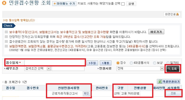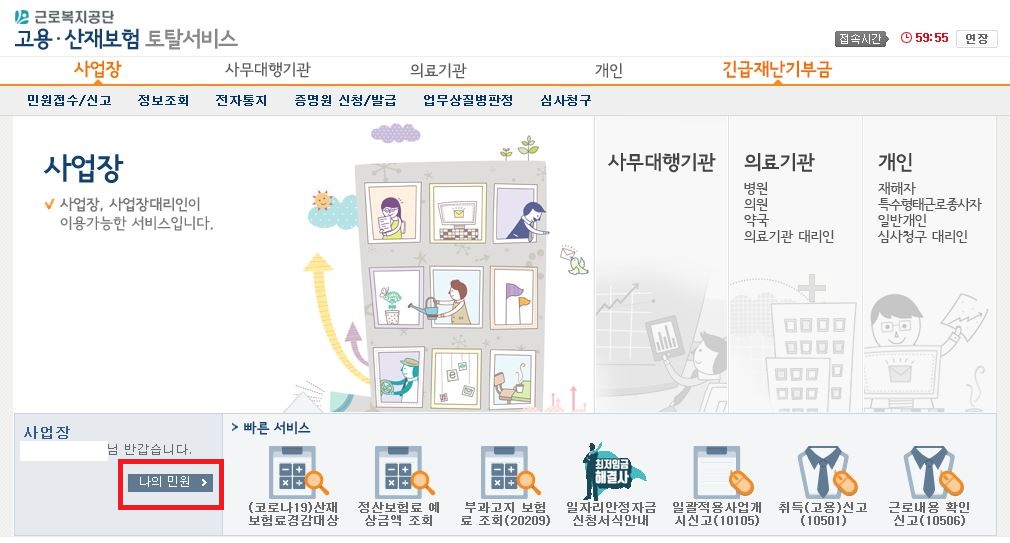 ◆ 고용·산재보험 토탈서비스 접속(total.kcomwel.or.kr/) > 사업장로그인 > 나의민원