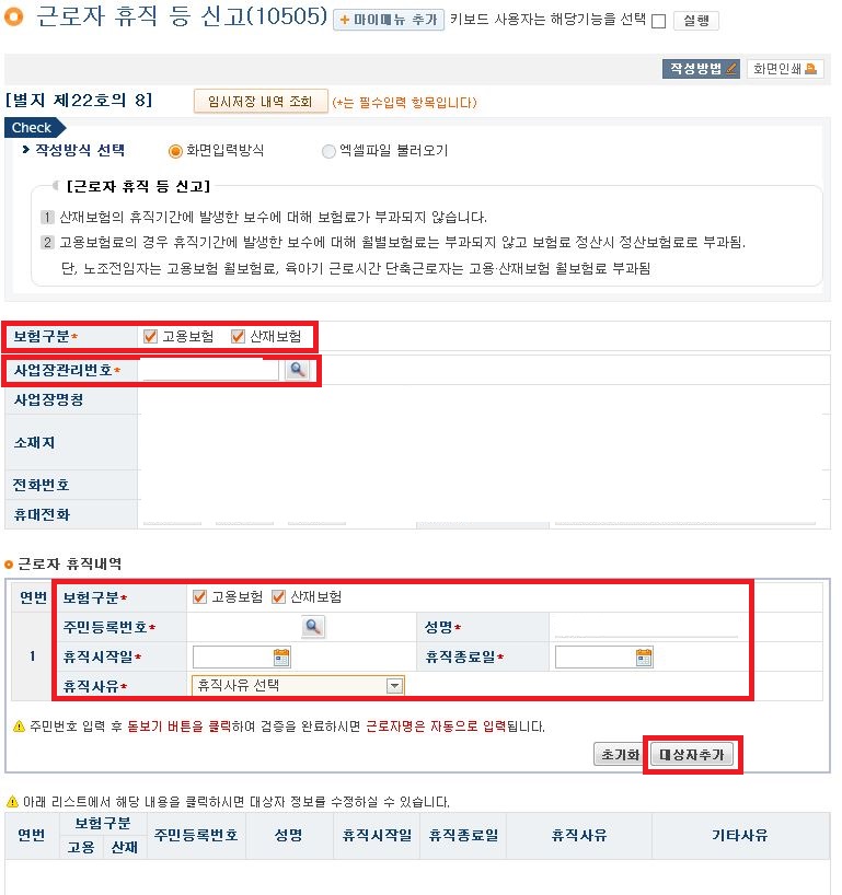 - 근로자휴직내역의 보험구분에 마찬가지로 고용보험과 산재보험을 모두 체크해줍니다.