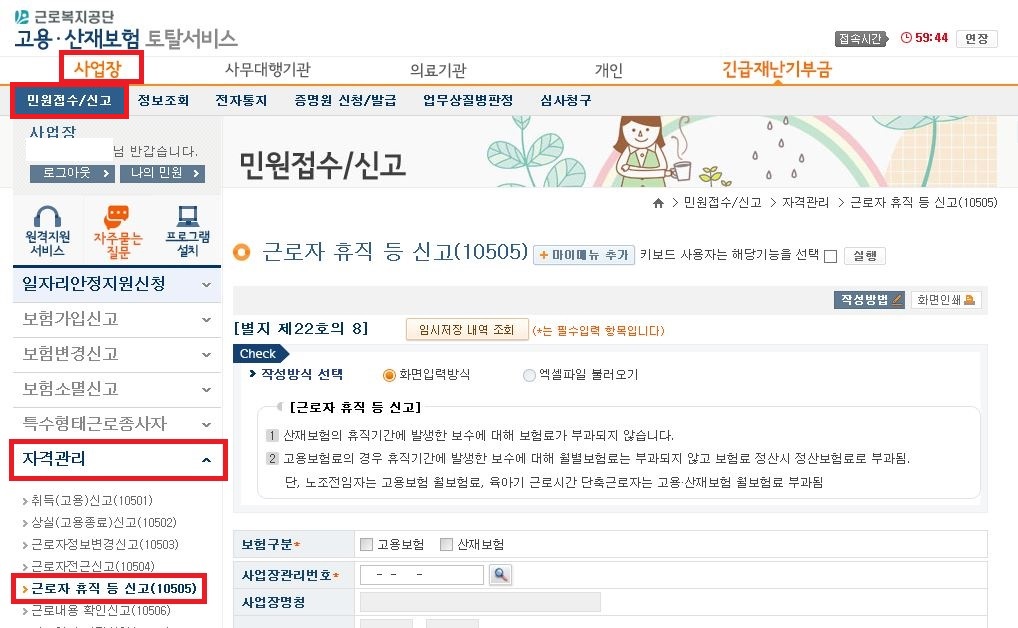◆ 고용·산재보험 토탈서비스 접속(total.kcomwel.or.kr/) > 사업장로그인 > 사업장 > 민원접수/신고 > 자격관리 > 근로자 휴직 등 신고