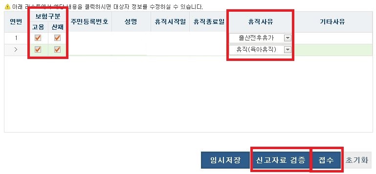 추가된 대상자의 휴직사유와 휴직시작일, 종료일 등을 확인하신 후 신고자료 검증을 눌러 이상이 없으면 접수버튼을 눌러줍니다.