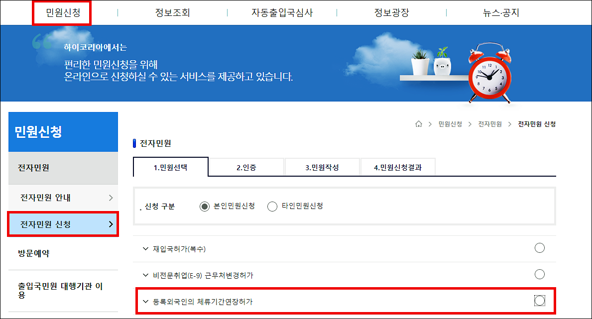 1. 하이코리아(https://www.hikorea.go.kr) 로그인→ 민원신청 → 전자민원 → 등록외국인의 체류기간 연장허가 클릭