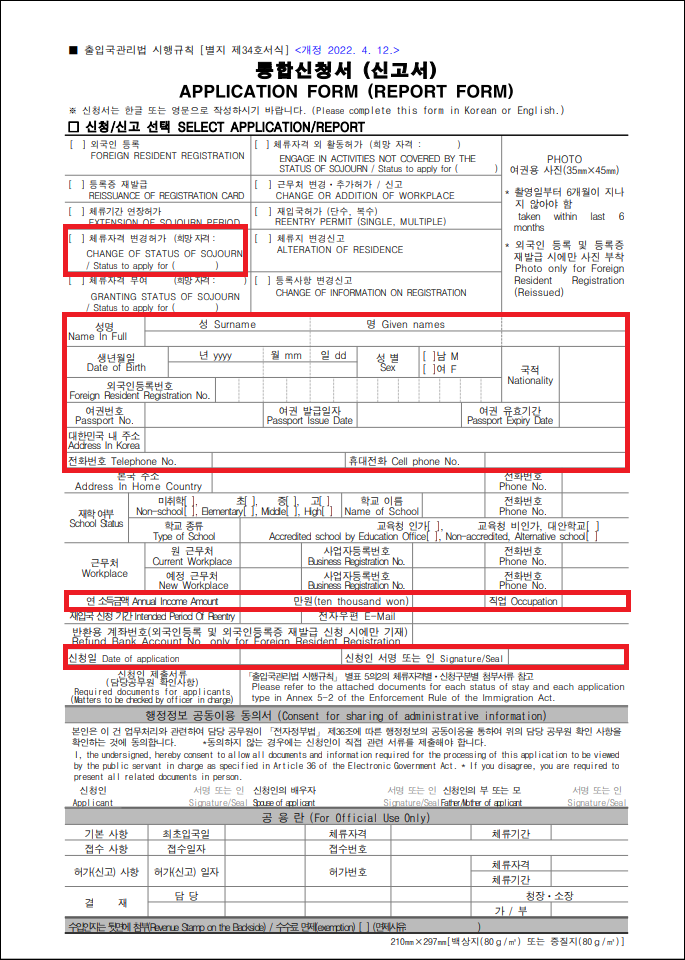 - 신청서(체류자격 변경허가 체크, 희망 자격: G-1)