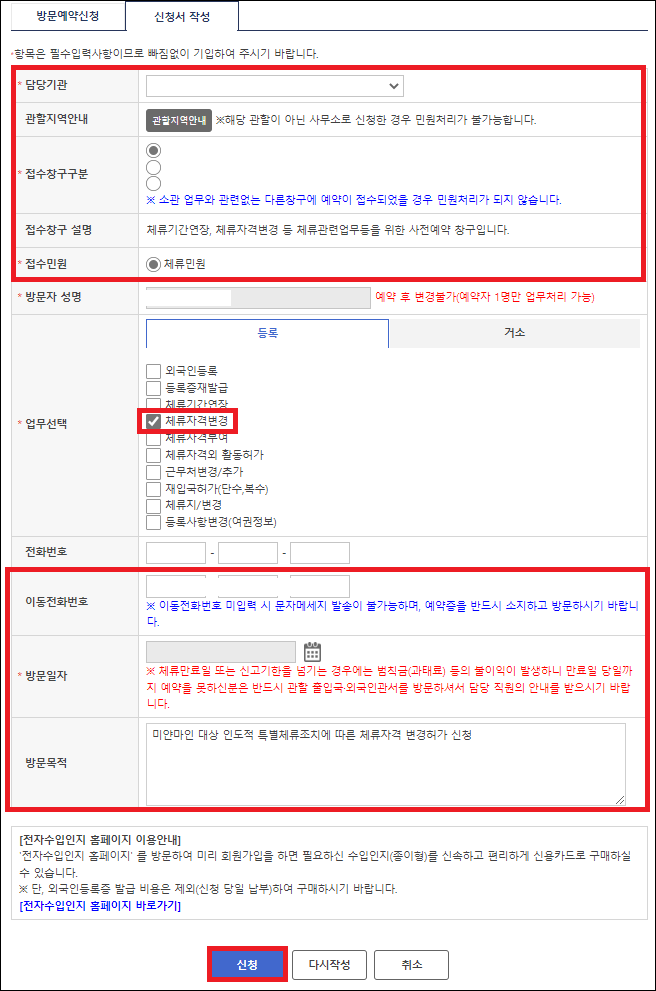 - 하이코리아(https://www.hikorea.go.kr) 접속 → 로그인 → 민원신청 → 방문예약