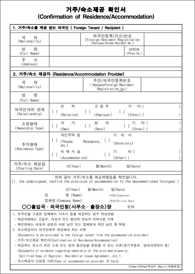 - 거주숙소제공확인서 작성 후 회사명의 임대 기숙사일 경우 임대차계약서 등을 함께 준비해줍니다.
