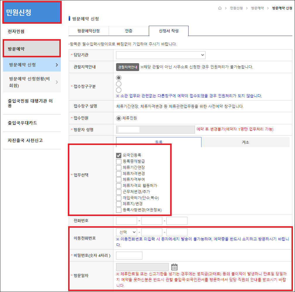 - 관할 출입국사무소 → 외국인등록 업무 선택 → 휴대폰번호, 비밀번호(비회원의경우), 방문일자 입력