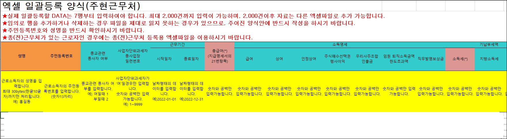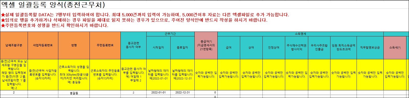 - 중도입사자의 경우 반드시 종전근무지의 사업장 정보와 종전근무지에서 받은 급여, 기납부 소득세 등을 입력하여 업로드하여야 합니다.