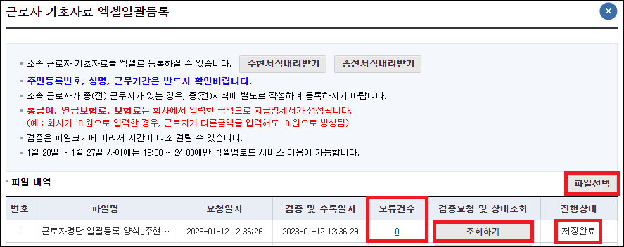 - 오류건수가 0이고 진행상태에 저장완료라고 뜨면 파일 업로드가 완료된 것입니다.