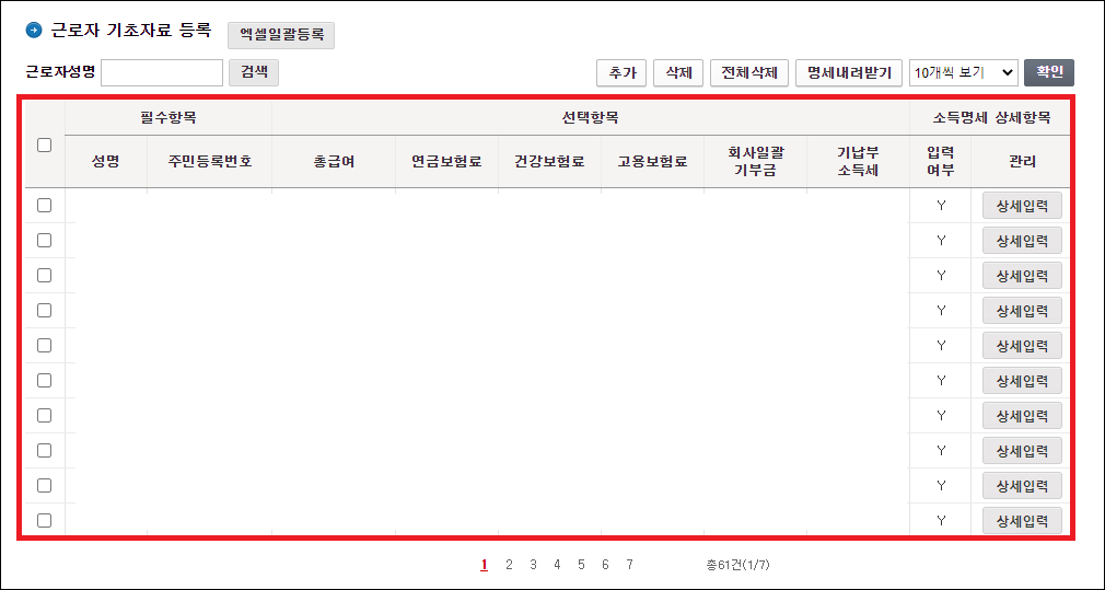 근로자 기초자료 등록이 완료되면 등록된 근로자의 정보와 급여등 정보가 나타납니다.