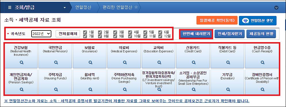 2. 귀속연도, 월 선택 → 해당내용 클릭 → 한번에 내려받기