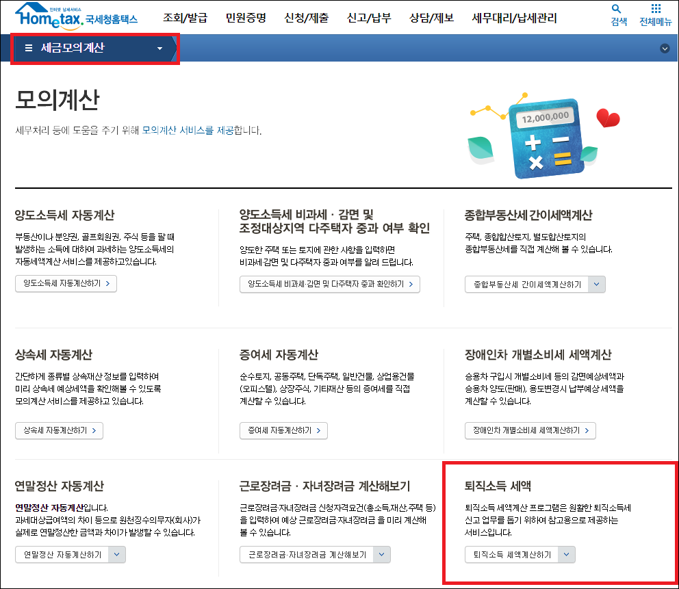 퇴직소득세 계산이 어려우시거나 계산 후 검증을 원하시는 분들은 아래와 같이 국세청홈택스의 세금모의계산 메뉴에서 퇴직소득 세액계산기를 통해 보다 간편하게 퇴직소득세를 계산해 보실 수 있습니다.