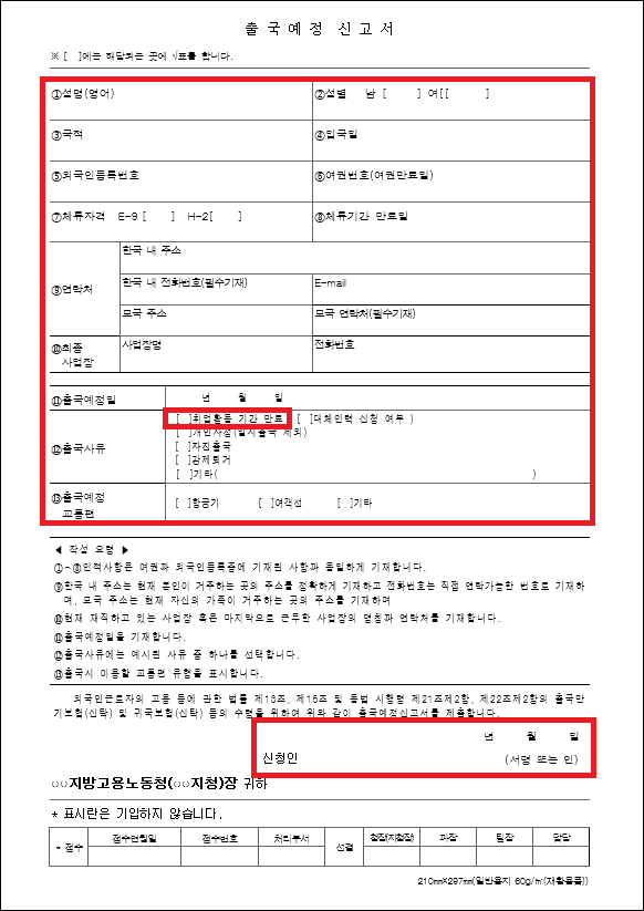 - 신청 연,월,일과 신청인을 기재후 서명합니다. 이 때 신청인에는 회사가 아닌 외국인근로자 본인의 이름과 서명이 기재되어야 합니다.