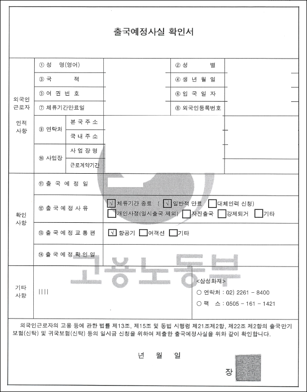 - 출국예정신고서(EPS(https://www.eps.go.kr) → 자료실 → 업무별 서식 → 출국예정신고서)
