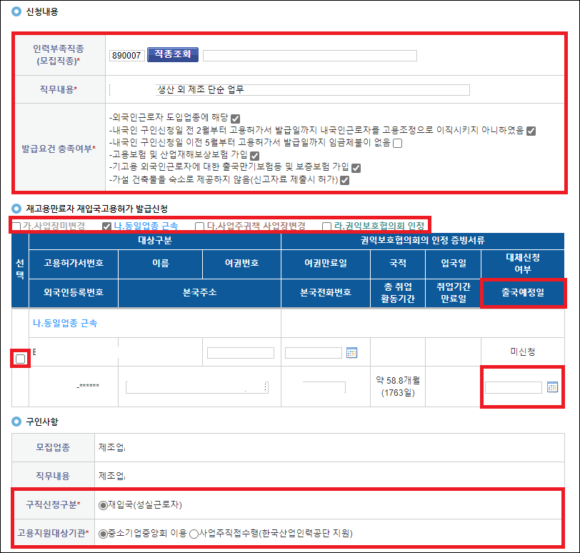 - 구인사항에서 구직신청구분에 재입국(성실근로자)을 체크하시고 고용지원대상기관에 도입위탁기관인 중소기업중앙회 이용을 선택합니다. 사업주직접수행을 선택할 경우 외국인근로자 도입 업무를 위탁하지 않고 사용자가 스스로 수행하면 되는데 절차가 꽤 복잡해 비추천드립니다.