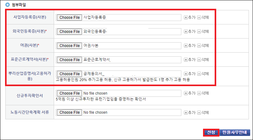 - 사업자등록증 사본과 외국인등록증 사본, 여권사본, 근로계약서 사본을 첨부파일로 등록해 줍니다.