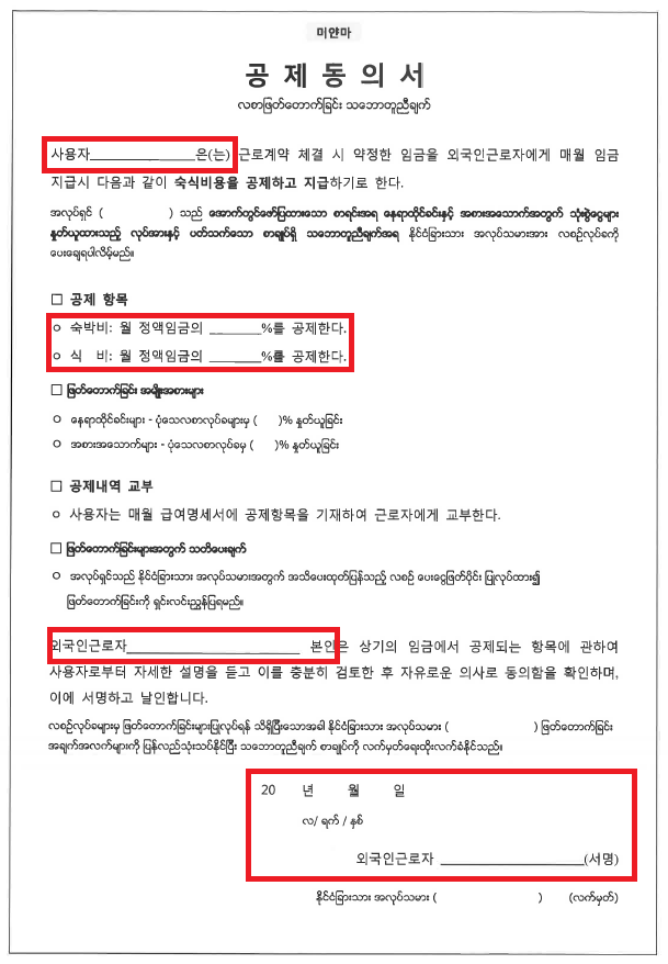 - 숙식비에 대한 근로자 부담분이 있다면 공제동의서를 작성해 함께 첨부해 줍니다. 공제동의서는 EPS 고용관리시스템(https://www.eps.go.kr) 자료실→업무별 서식에서 다운로드합니다.