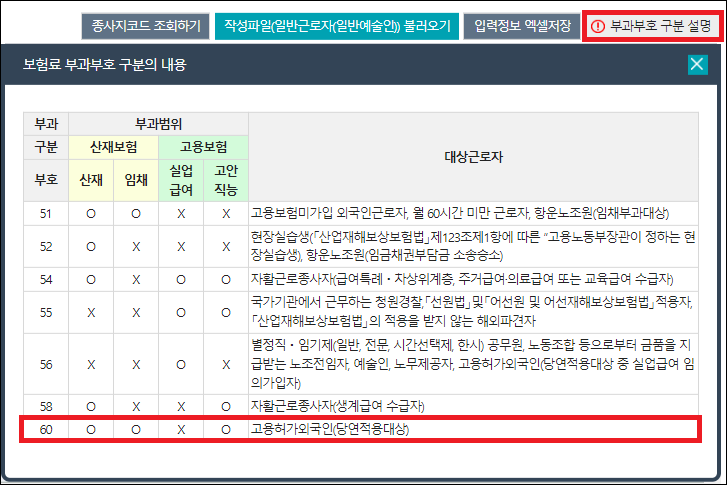 - 예를 들어, 위의 내용에 해당하지 않는 내국인 일반 근로자라면 부과부호를 입력하지 않으셔도 되고 고용보험 당연적용대상 외국인근로자라면 부과부호 60을 입력해 줍니다.