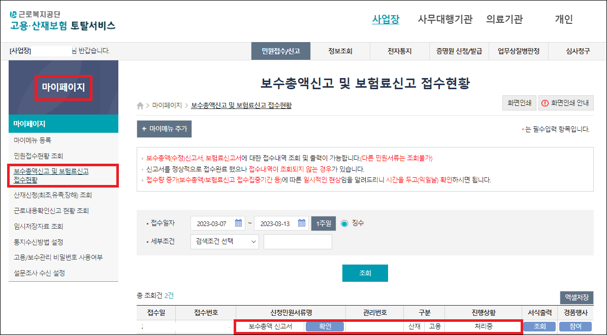 6. 마이페이지 → 보수총액신고 및 보험료신고 접수현황