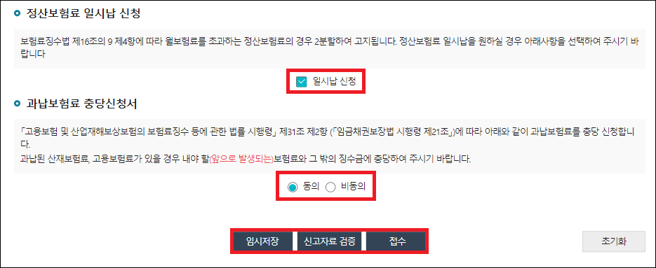 5. 정상보험료 일시납 신청, 과납보험료 충당신청 동의 여부 체크 → 신고