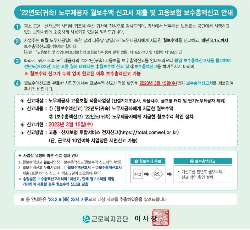 5. 고용산재보험 보수총액신고 기간: 매년 3월 15일까지