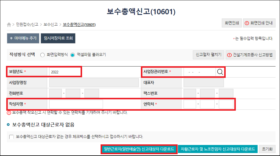 - 작성자명과 연락처를 입력한 후 일반근로자 신고대상자 다운로드를 클릭해 보수총액 신고 엑셀 서식을 다운로드해줍니다.