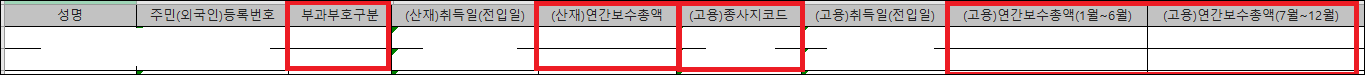 엑셀파일에 신고대상자의 성명, 주민등록번호, 고용산재 취득일은 자동으로 기재되어 있으므로 근로자별 부과부호구분과 종사지코드, 연간 보수총액을 입력해 줍니다.