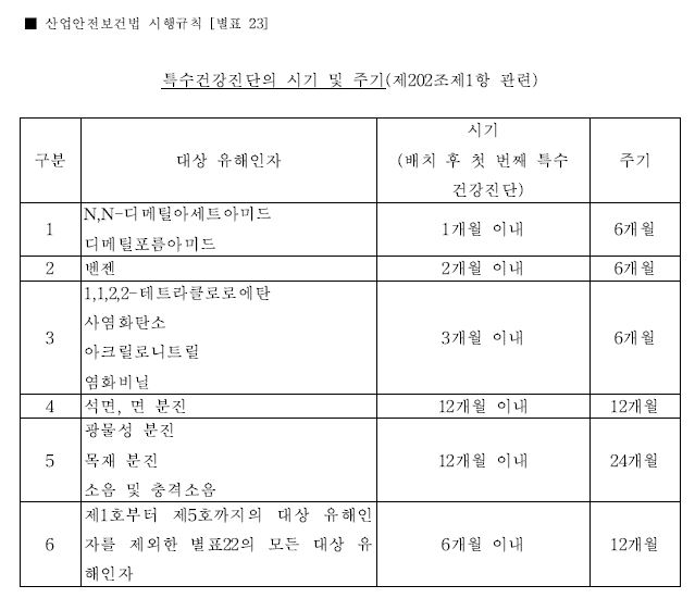 | 작업환경측정 주기/방법/과태료 - 특수(배치전)건강검진 선행 항목 (0) | 2022.04.22 |