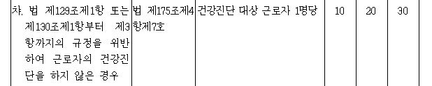 ◆ 특수건강검진 미실시 시 대상근로자 한 명당 10만원의 과태료가 부과되며, 위반 횟수가 2차인 경우 20만원, 3차 이상인 경우에는 30만원의 과태료가 부과됩니다.