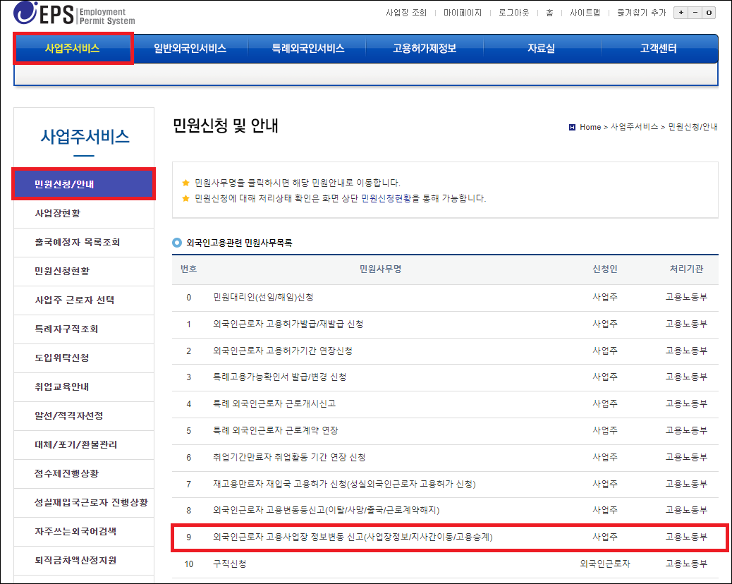 1. 외국인 고용관리 시스템() 접속 → 사업주 서비스 → 민원신청/안내 → 외국인근로자 고용사업장 정보변동 신고