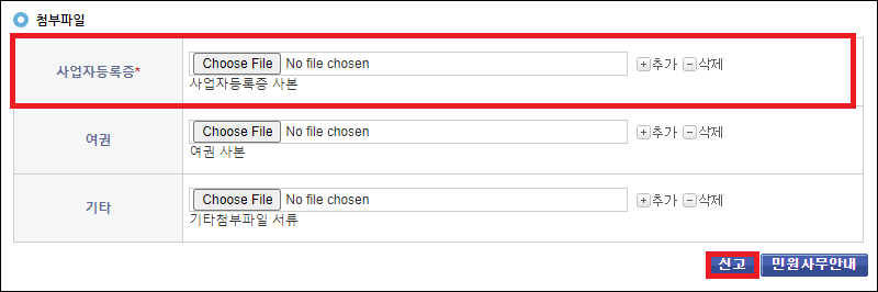 - 사업장명, 소재지, 대표자 변경의 경우 변경된 ★사업자등록증, 법인등기부등본, 대표이사 신분증★을 첨부한 후 신고 버튼을 눌러줍니다.