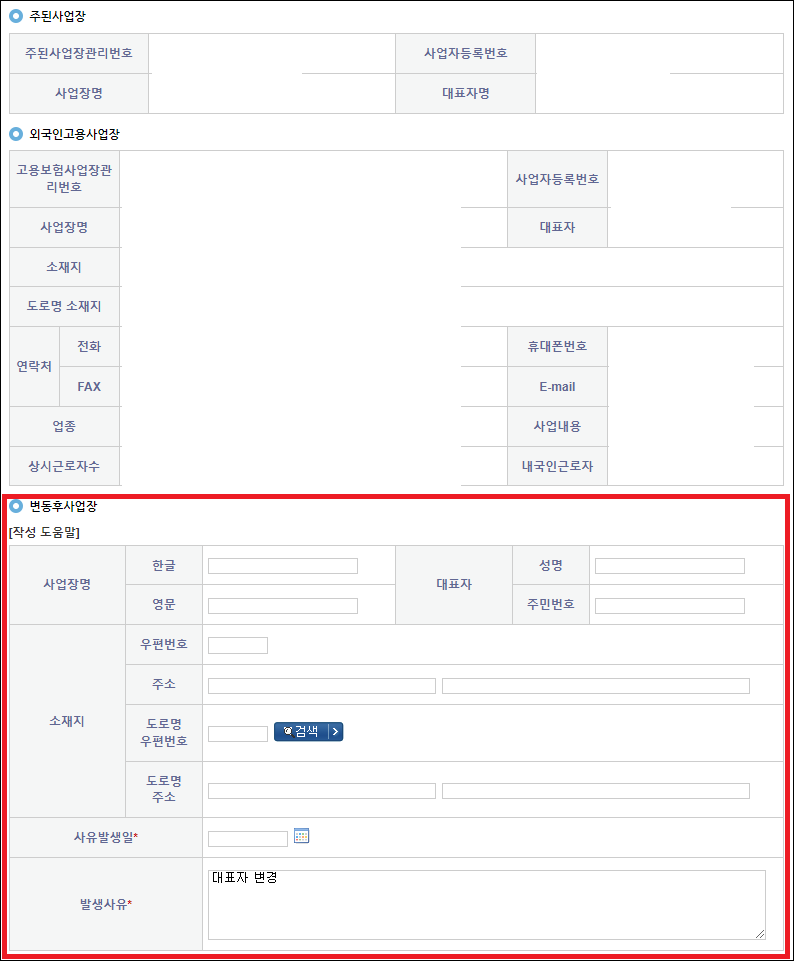 - 사업장명, 주소, 대표자가 변경되었을 경우 변동 후 사업장 정보란에 변경된 정보를 입력하여 줍니다.