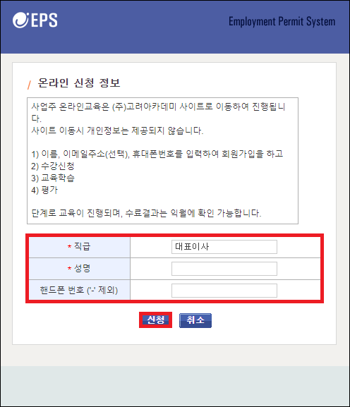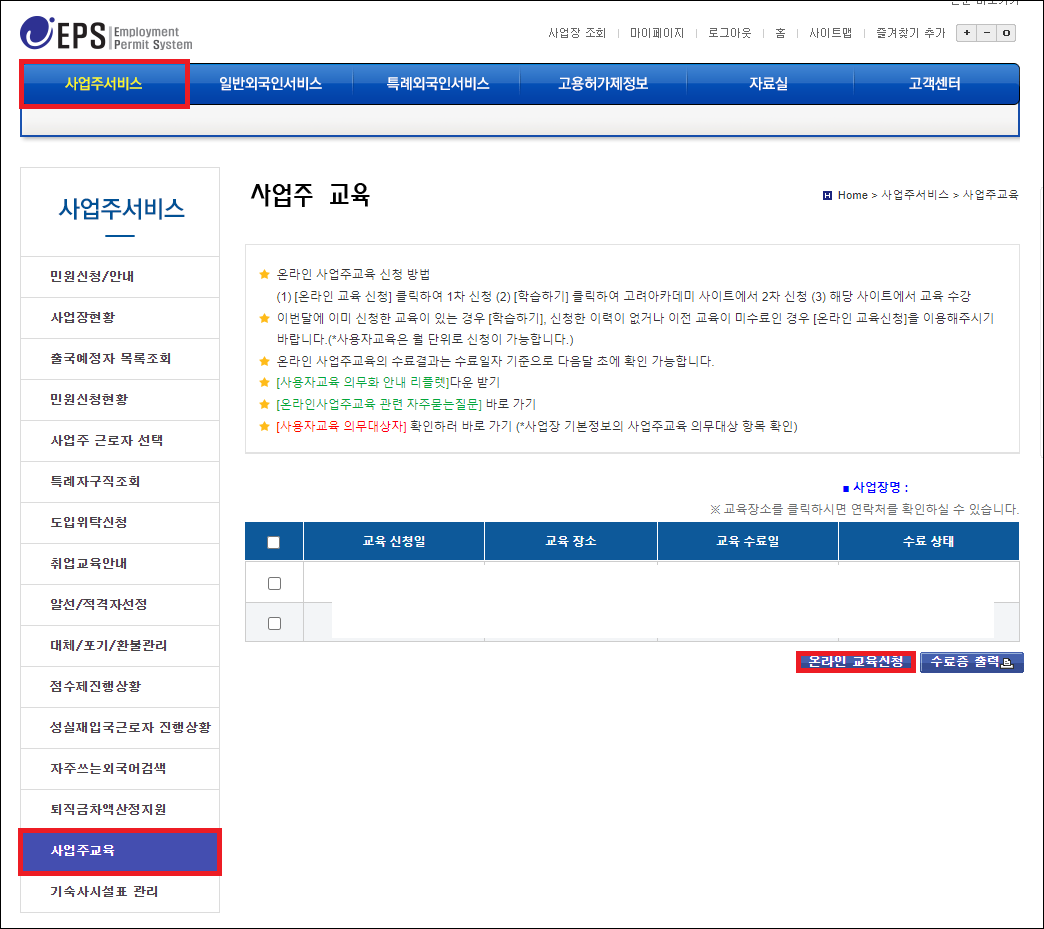 사업주 교육은 외국인고용관리 시스템 홈페이지에서 온라인 교육수강을 신청할 수 있습니다.