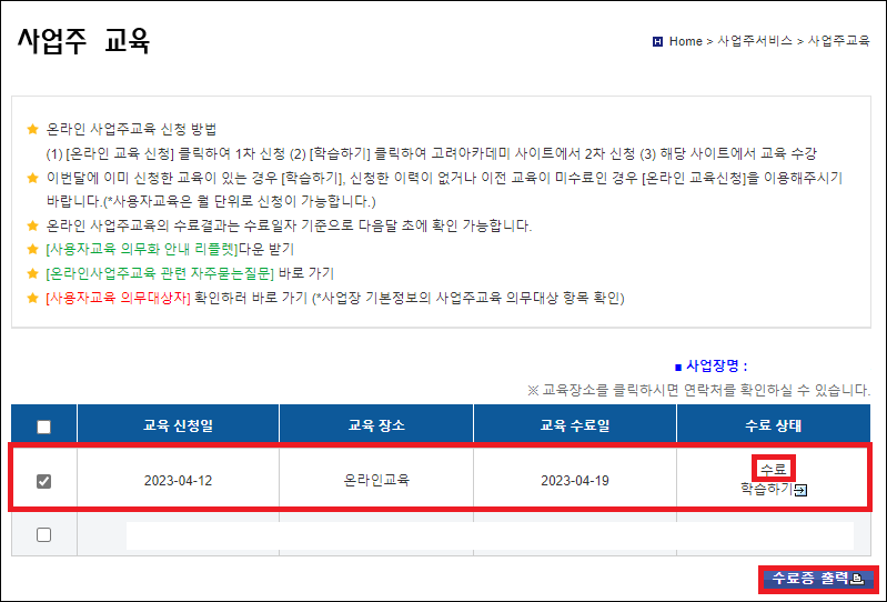 EPS 사업주 교육 메뉴에서 수료완료된 교육을 선택 후 수료증 출력을 눌러 수료증을 출력합니다. 수료증은 교육 수료 후 2일 후에 출력 가능합니다.
