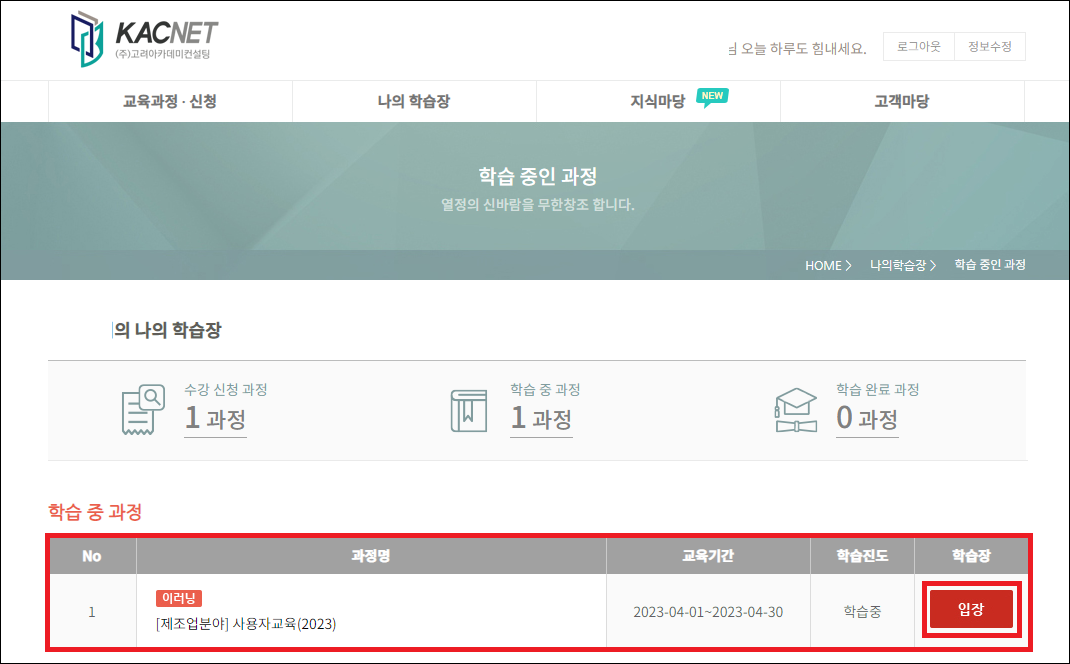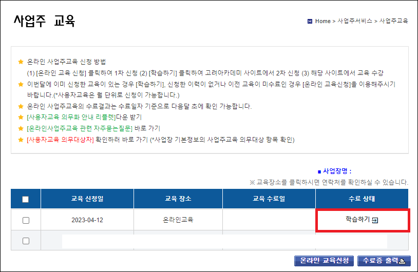 온라인 교육신청을 하면 사업주 교육 메뉴에 교육 신청일과 학습하기 버튼이 활성화됩니다. 학습하기 버튼을 눌러 교육사이트로 이동합니다.