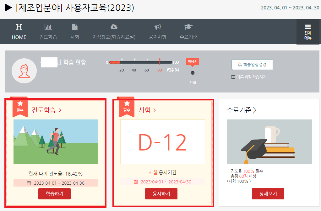 - 진도학습의 학습하기를 클릭해 정해진 교육기간 내에 교육을 수강합니다. 진도율이 100%가 되지 않는 다면 수료되지 않기 때문에 반드시 교육을 끝까지 모두 수강하여 줍니다.