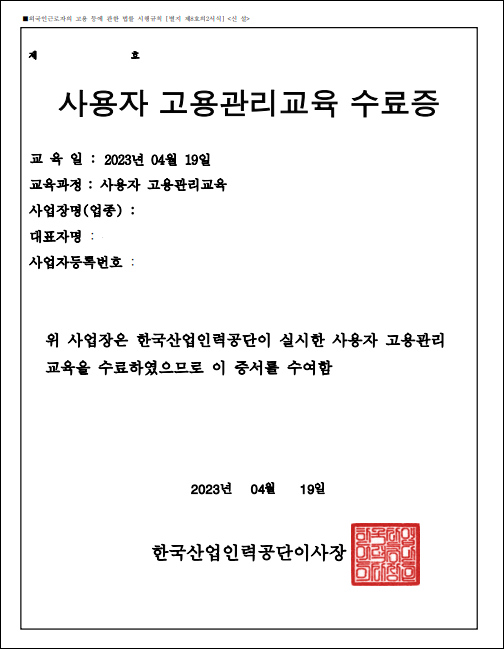 외국인근로자 고용 사업장의 사업주는 외국인근로자 고용허가서를 최초로 발급받은 날로부터 6개월 이내에 사용자 교육을 수강하여야 합니다. 사업장의 대표자가 변경되었다면 변경된 대표자도 교육을 새로 수강하여야 하며 사업주 교육을 미수강 할 시 300만원의 과태료가 부과됩니다. 사업주 교육은 EPS 사이트에서 신청하여 온라인으로 수강할 수 있습니다.