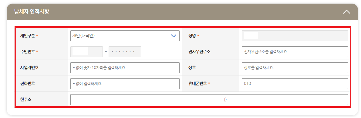 - 납세자의 휴대폰번호, 주소지 등 인저사항을 기재합니다.