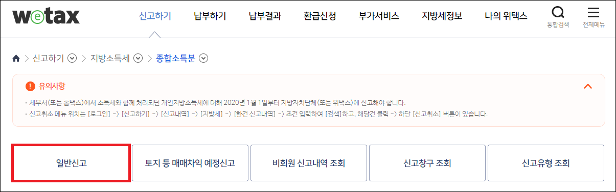 - 지방소득세 종합소득분 신고를 위해서는 위택스 홈페이지 로그인 후 지방소득세 종합소득분 일반신고 메뉴를 클릭해 줍니다.