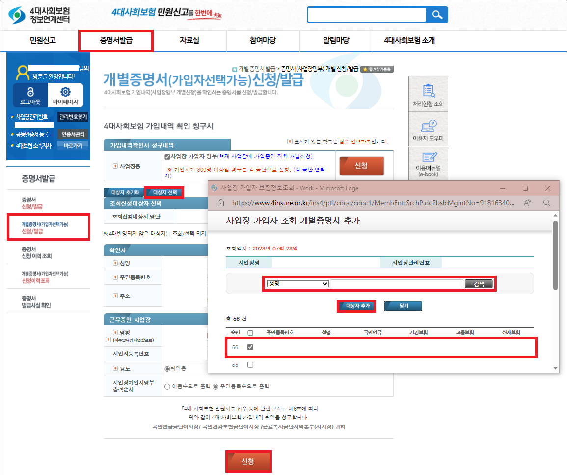 - 발급방법: 4대 사회보험 정보연계센터(https://www.4insure.or.kr) → 사업장 로그인 → 증명서 발급 → 개별증명서 신청/발급 → 대상자 선택 → 검색 → 대상자 추가 → 신청