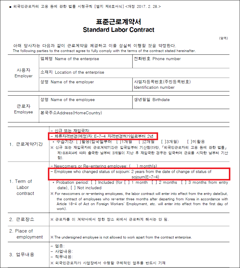 - E-7-4 전환일로부터 계약기간이 1년 이상인 근로계약 체결