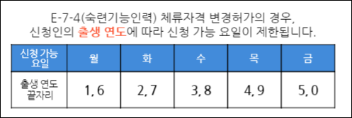 하이코리아를 통한 E-7-4 체류자격 변경허가 신청은 신청자의 출생 연도에 따라 신청 가능 요일이 아래와 같이 제한되므로 참고하여 신청하여 주시기 바랍니다.