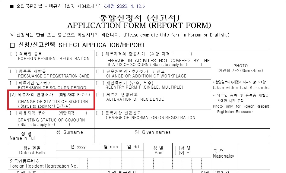 통합신청서 작성 시 체류자격 변경허가 항목 체크 후 희망 자격에 E-7-4를 기재합니다.