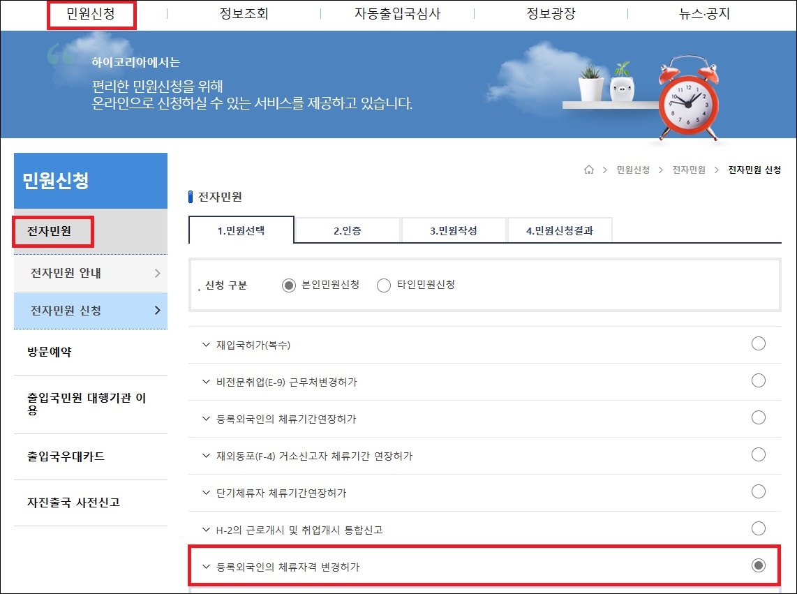 1. 하이코리아(https://www.hikorea.go.kr) 로그인 → 민원신청 → 전자민원 → 등록외국인의 체류자격 변경허가